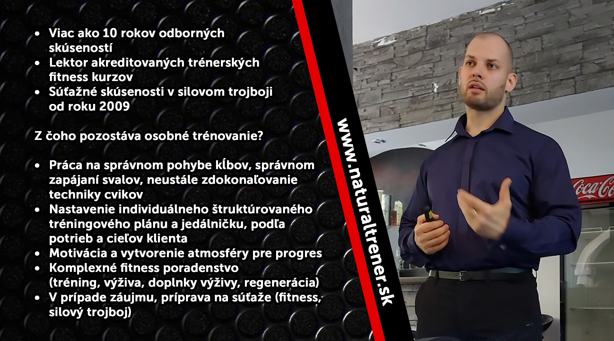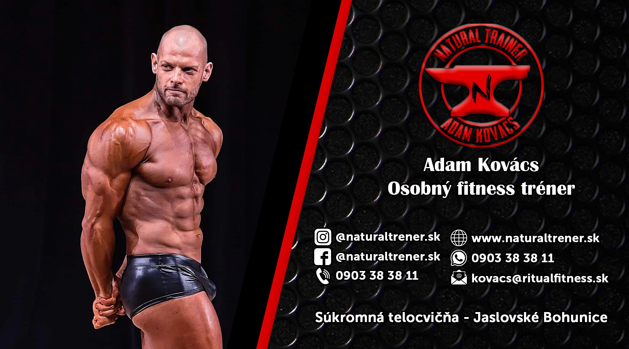 www.naturaltrener.sk - Osobný fitness tréner Jaslovské Bohunice (iba 9km od mesta Trnava). • Viac ako 10 rokov odborných skúseností • Lektor akreditovaných kurzov • Práca na správnom pohybe kĺbov, zapájaní svalov, neustále zdokonaľovanie techniky • Nastavenie tréningového plánu a jedálničku, podľa potrieb a cieľov klienta • Motivácia a vytvorenie atmosféry pre progres • Komplex. fitness poradenstvo (tréning, výživa, doplnky výž., regenerácia) • V prípade záujmu, príprava na súťaže
