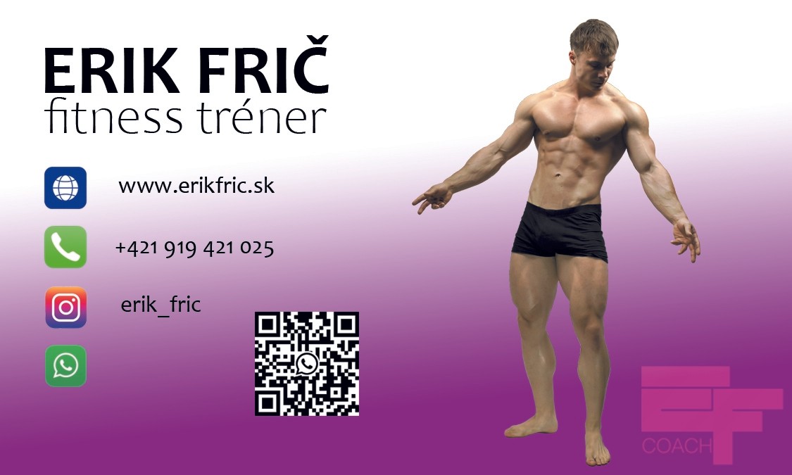 Moje meno je Erik Frič a som certifikovaný tréner 3. kvalifikačného stupňa. Špecializujem sa na poradenstvo pre výživu a zdravý životný štýl. Čo to pre teba znamená v praxi? Stravovací a tréningový plán zostavený podľa toho, či chceš chudnúť alebo naberať spolu s asistenciou pri individuálnych tréningoch alebo online poradenstvom. Skrátka – ak chceš zmeniť svoj život a žiť zdravšie a šťastnejšie, som tu aj pre teba.