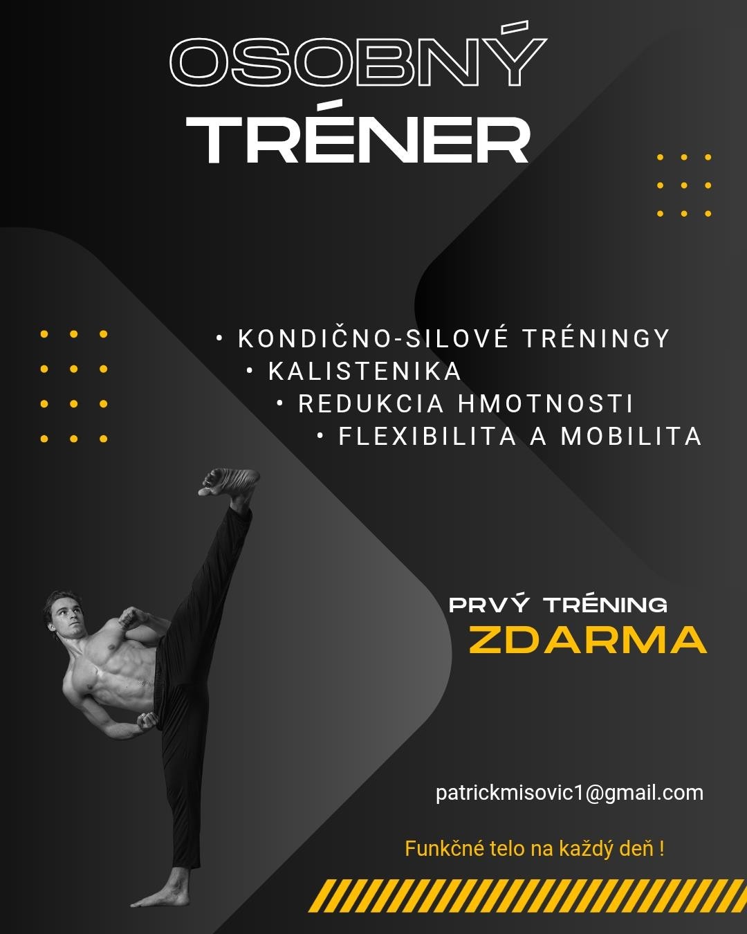 Ahojte, volám sa Patrik a som absolvent Fakulty telesnej výchovy a športu. Špecializujem sa na: • kondično-silový tréning • kalisteniku • zlepšenie držania tela • zdokonalenie techniky cvičenia • strečing - zlepšenie pohyblivosti Nečakaj a začni svoju premenu už dnes. Vstupný tréning ZDARMA Bratislava Pomôžem ti dosiahnuť tvoje ciele.